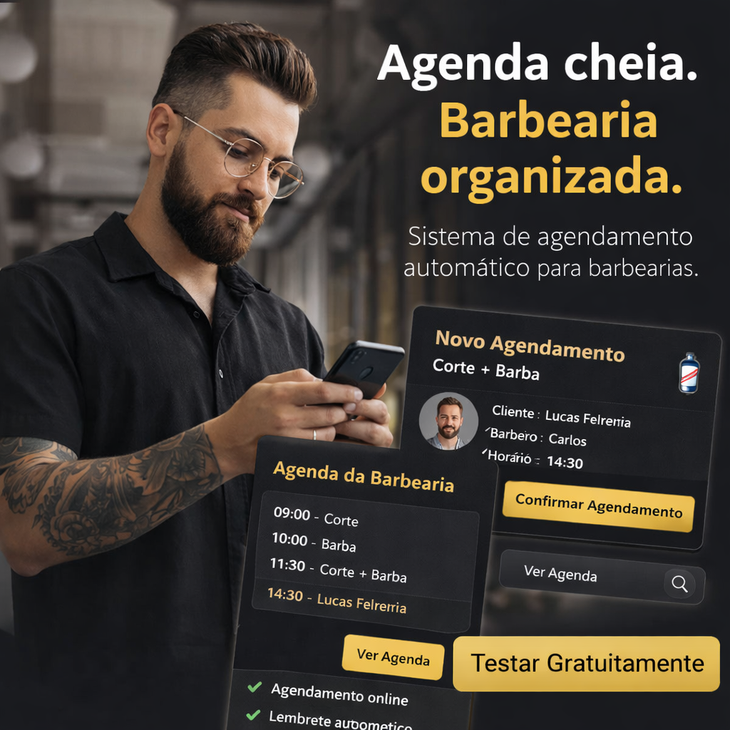 Basta acessar o link da sua barbearia no sistema, escolher o serviço e o horário disponível. O agendamento é confirmado automaticamente.